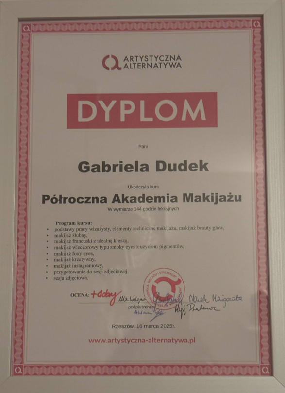 Jestem Gabriela, pasjonatka makijażu, którą sztuka ta fascynuje od młodzieńczych lat. Ukończyłam Artystyczną Szkołę Wizażu i Stylizacji w Rzeszowie. Specjalizuję się w makijażach wieczorowych, okolicznościowych, smokey eye, foxy eye, ślubnych, francuskich, glow, dziennych oraz biznesowych, zawsze dążąc do podkreślenia naturalnego piękna moich klientów.